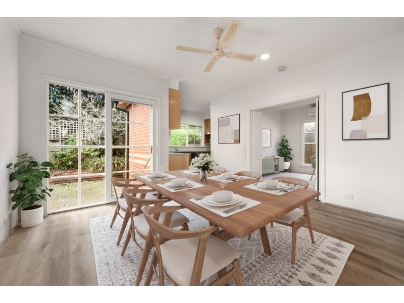 Privately positioned at the rear of just two residences, this charming single-level, Federation-inspired townhouse offers comfort, space and privacy in a highly sought-after Camberwell location. Set within neatly maintained garden surrounds on a quiet, tree-lined street near Wattle Park, the home enjoys a peaceful atmosphere while remaining close to everyday conveniences. Local cafés and shops are just a short stroll away, with easy access to Riversdale Road trams, parklands including Cooper Reserve, and a selection of highly regarded schools, all within an approximate 2km radius. Inside, the light-filled interior showcases a desirable north-facing rear aspect and new floorboards throughout. The layout includes a spacious sitting room with box bay window, adjoining dining area, and a well-appointed timber kitchen with meals space, connecting to a full laundry. Two generous bedrooms both feature built-in robes, serviced by a pristine central bathroom and separate WC. Outdoor enjoyment is effortless with a sun-drenched, leafy courtyard ideal for relaxed outdoor dining. Additional features include ducted heating, reverse-cycle air conditioning, ceiling fans, and a remote-access garage with turning area. A beautifully presented home offering low-maintenance living in one of Camberwell’s most desirable pockets. *To register to inspect please click “Virtual Tour” or “Book Inspection” so we can keep you informed of inspection times and changes. *Photo ID may be required at open for inspections.