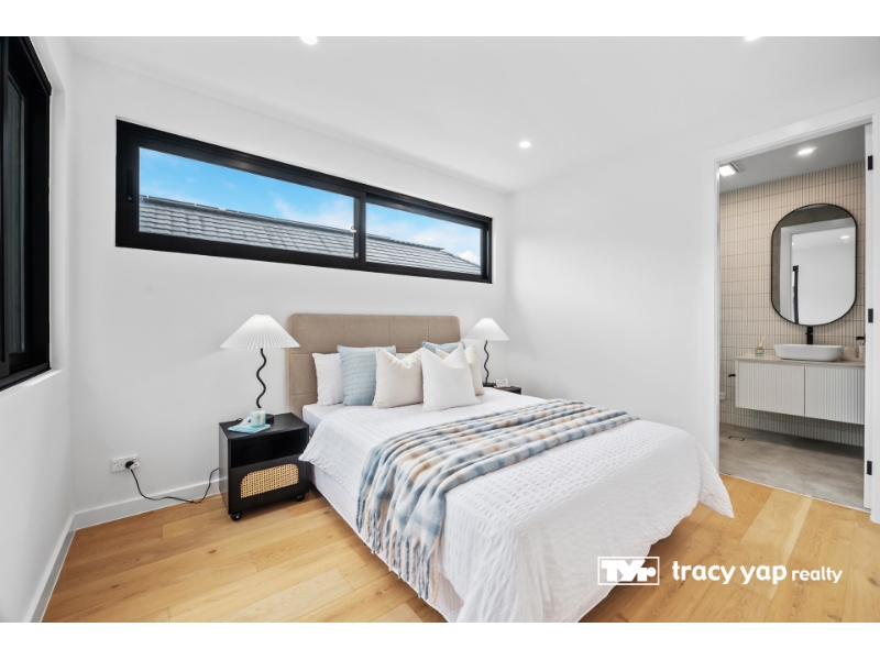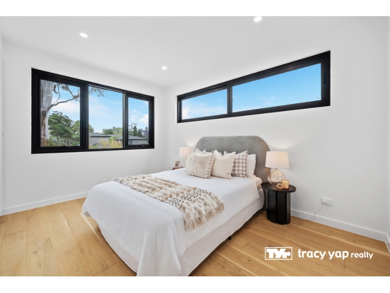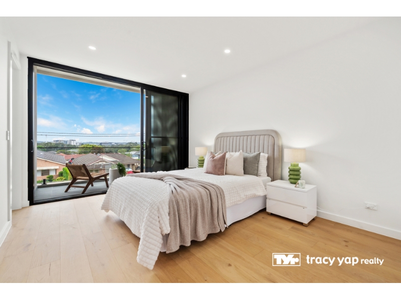 Detail: Lynn 0401 900 698. Perched on a peaceful, tree-lined street, this stunning architect-designed duplex offers contemporary luxury in one of Marsfield's most prestigious pockets. - 5 bedrooms, 3 with private ensuites - Designer kitchen with stone benchtops & Miele appliances - Open-plan living and dining with timber flooring - Timber deck, landscaped gardens & alfresco BBQ area - 4 sleek bathrooms with high-quality fittings - Daikin ducted air-conditioning, abundant natural light, district views - Zoned for Kent Road Public, Epping Boys HS & Ryde Secondary College - Short distance to Macquarie Centre, University & Metro